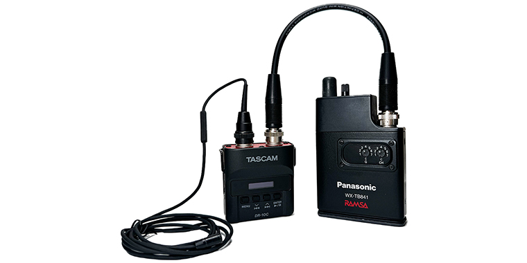 RAMSAのピンマイクと2ピース送信機の間に接続して使用することで
